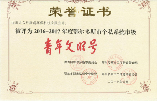 會(huì)上,久科環(huán)保被評(píng)為2016-2017年度鄂爾多斯市個(gè)私系統(tǒng)市級(jí)青年文明號(hào)。青年文明號(hào)的設(shè)立旨在營(yíng)造青年創(chuàng)新創(chuàng)業(yè)的良好氛圍,樹(shù)立青年創(chuàng)新創(chuàng)業(yè)光彩榜樣,彰顯鄂爾多斯新青年的時(shí)代風(fēng)貌,激勵(lì)全市各界青年積極投身社會(huì)經(jīng)濟(jì)建設(shè),為建設(shè)文明和諧鄂爾多斯作出新的更大的貢獻(xiàn)。