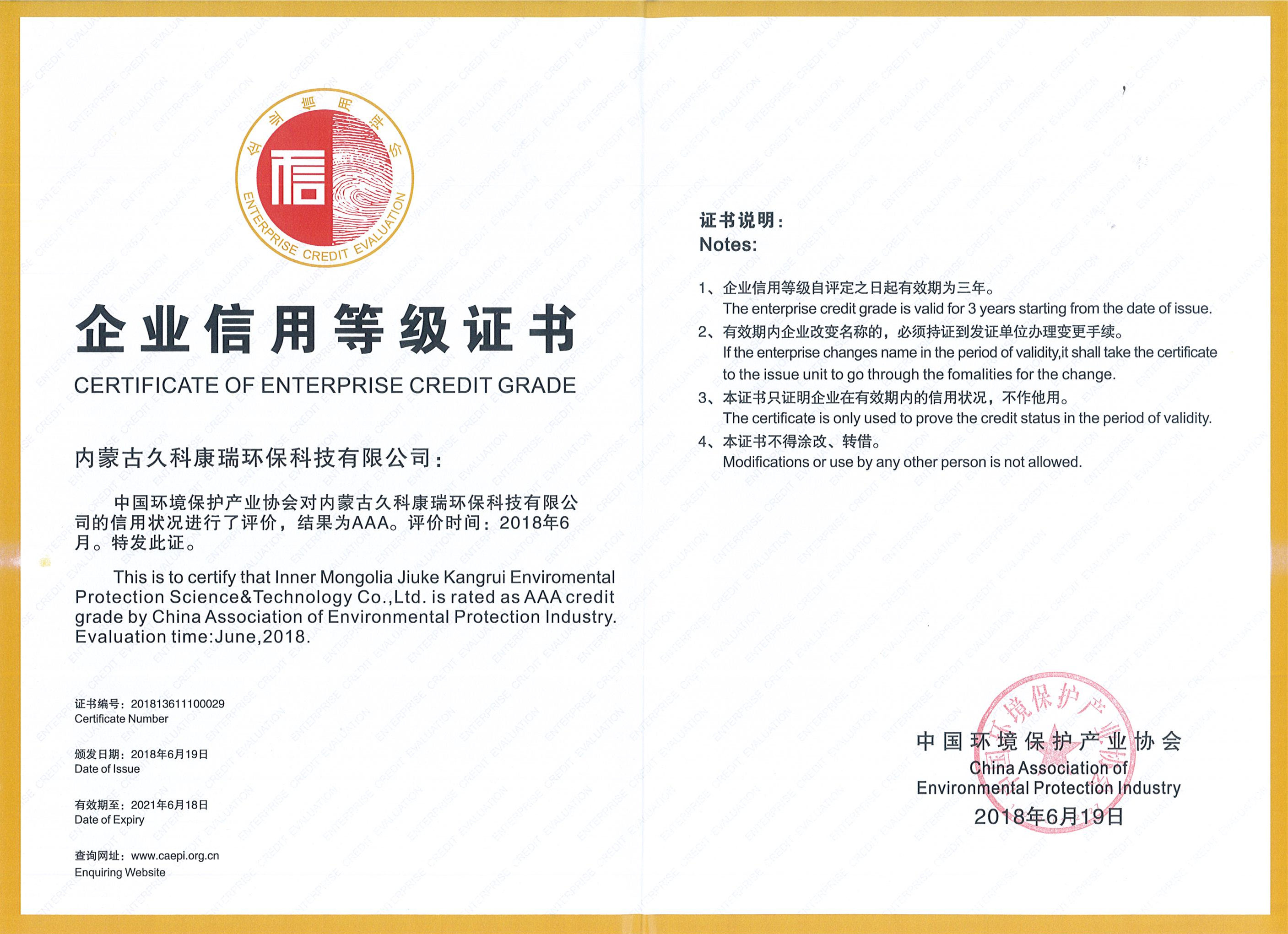 久科環(huán)保獲中國(guó)環(huán)境保護(hù)產(chǎn)業(yè)協(xié)會(huì)企業(yè)信用等級(jí)評(píng)價(jià)AAA評(píng)級(jí)