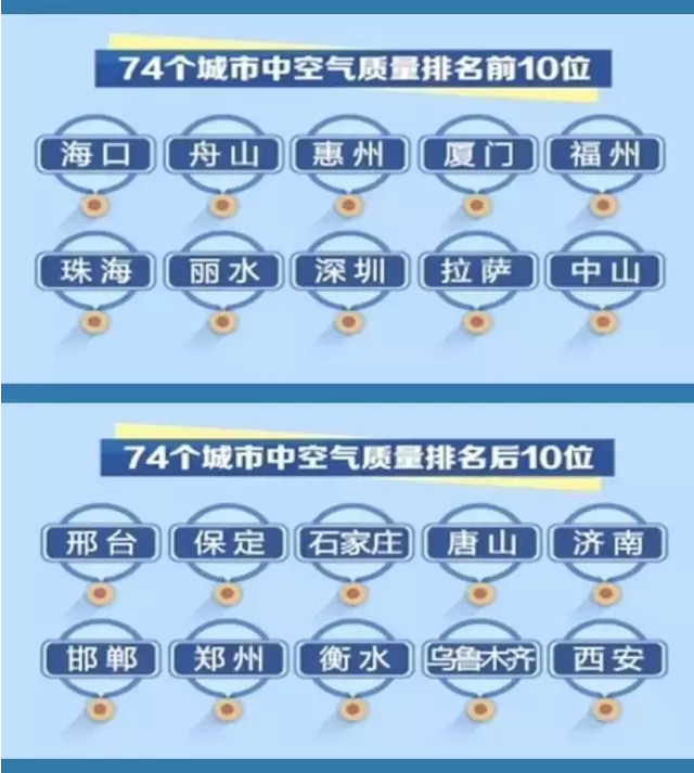 在74個城市中,空氣質(zhì)量排名前10位的是:海口、舟山、惠州、廈門、福州、珠海、麗水、深圳、拉薩和中山市。