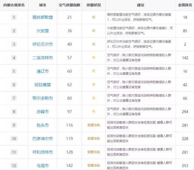 以上數(shù)據(jù)是今天內(nèi)蒙古12盟市空氣質(zhì)量指數(shù)排名和全國空氣質(zhì)量指數(shù)排名